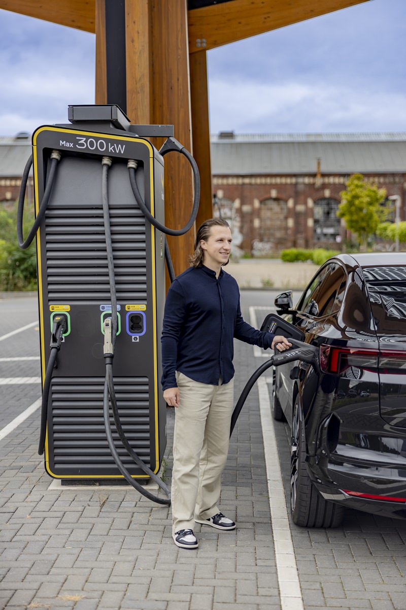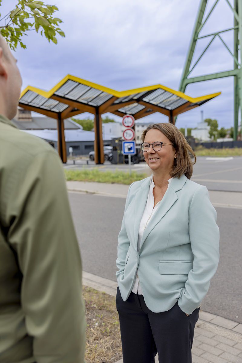 Das Fotoshooting fand an einem Tag an zwei unterschiedlichen Standorten statt. In Dinslaken bot die Schnelladestation für E-Autos durch ihre spannende Kulisse besonders viele Möglichkeiten. Der eigene Shop direkt vor Ort sorgte für zusätzliche, lebendige Motive.