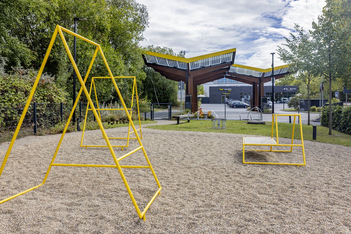 In Bochum wiederum liegt der Fokus auf einer familienfreundlichen Umgebung. Neben den modernen Schnellladestationen gibt es dort einen kleinen Spielplatz und eine gemütliche Fastned Lounge. Beide Elemente haben wir gezielt in die Bildsprache eingebunden, um zu zeigen, wie vielseitig die Standorte gestaltet sind und wie selbstverständlich sich das Aufladen der Elektroautos und Aufenthaltsqualität miteinander verbinden lassen.